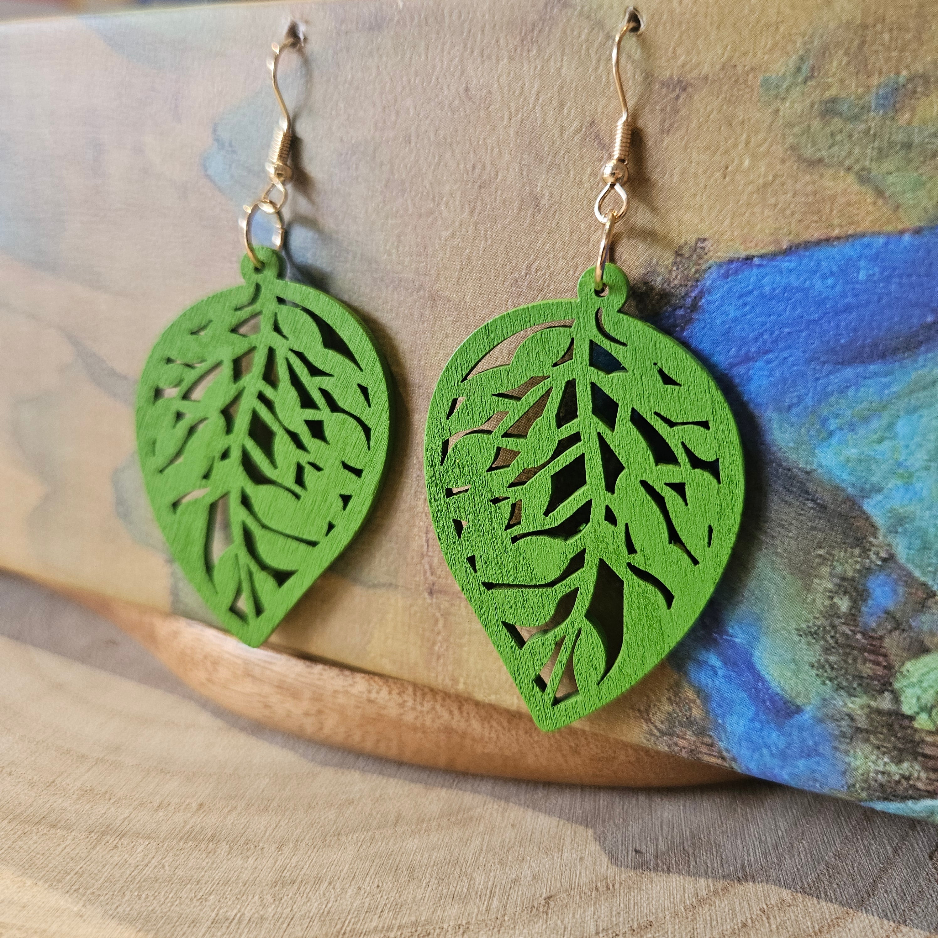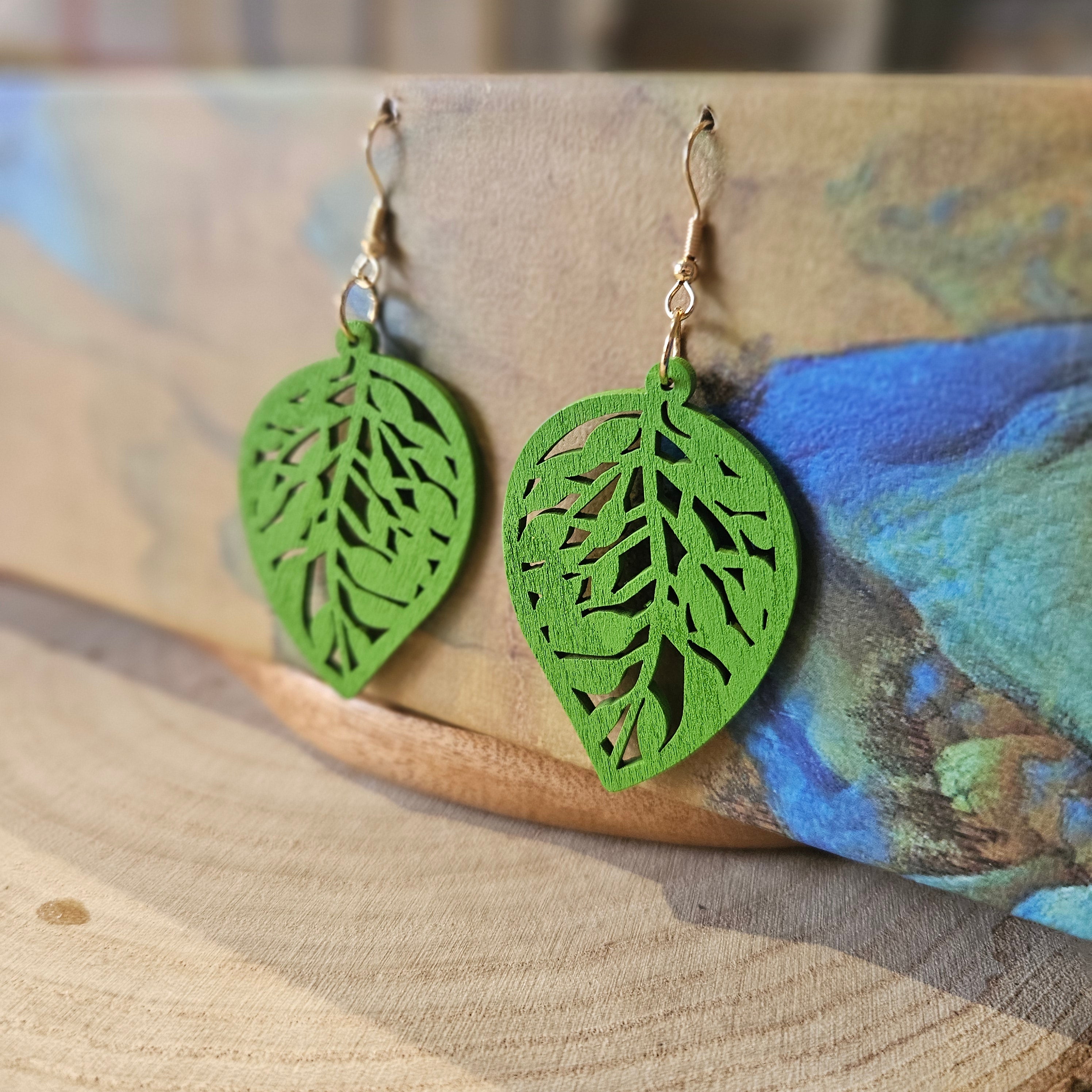 Wooden Leaf Shaped Earrings Bold Green