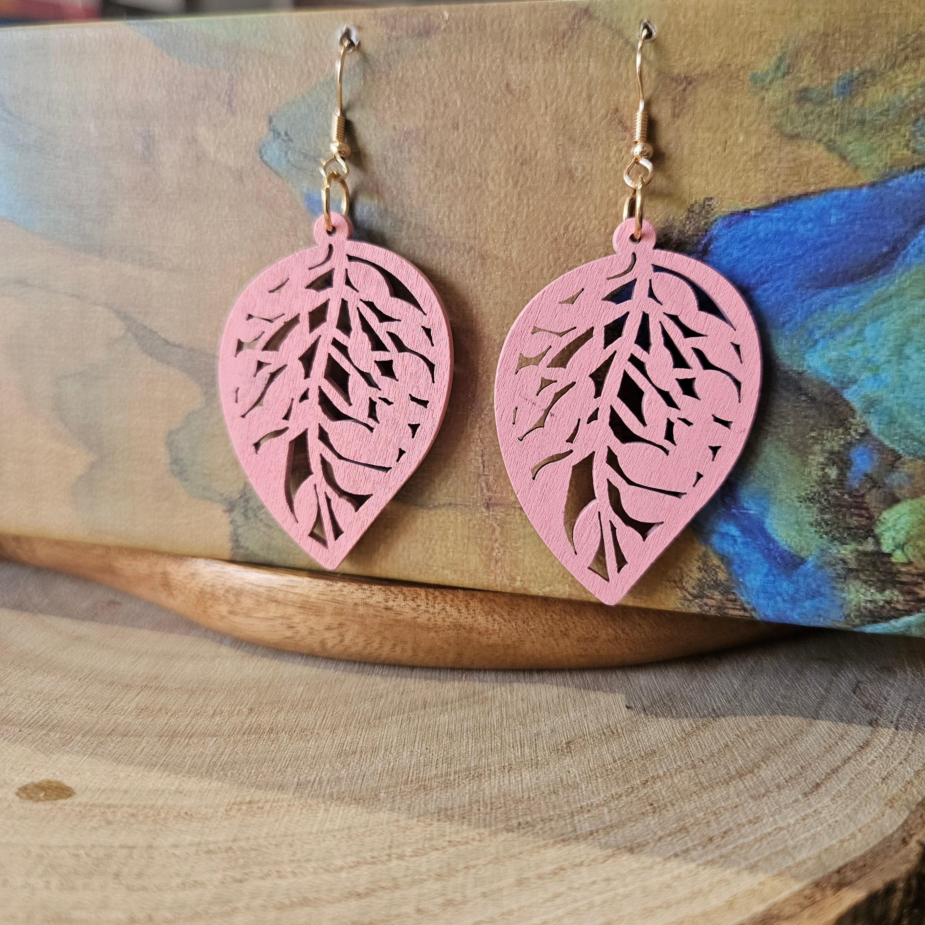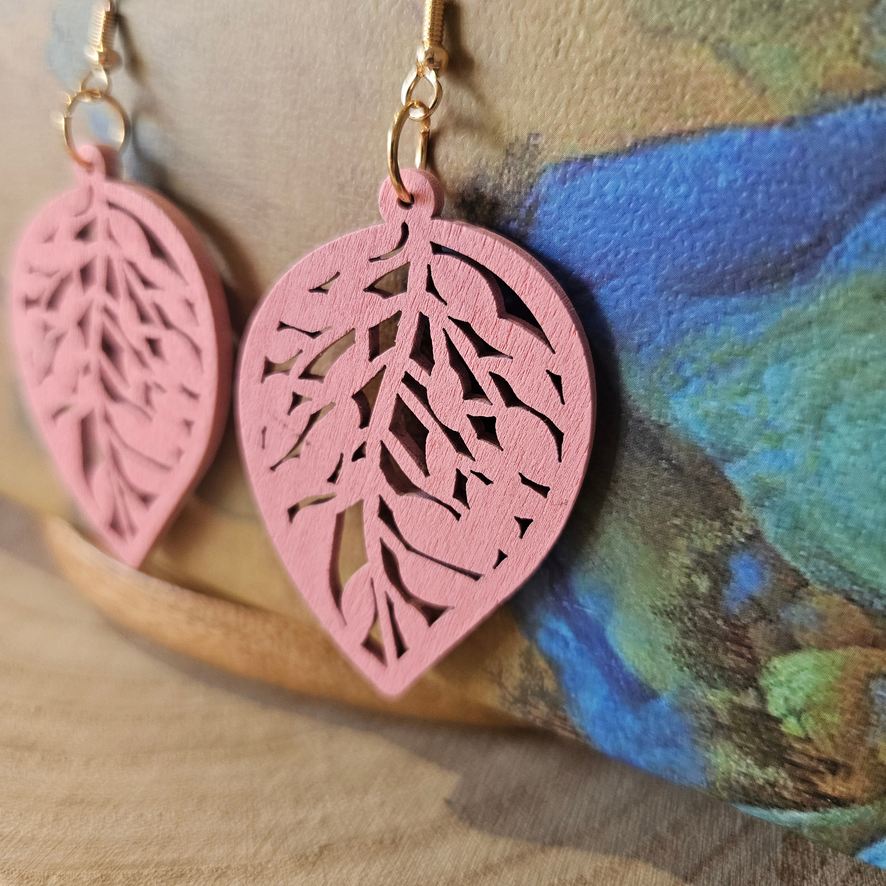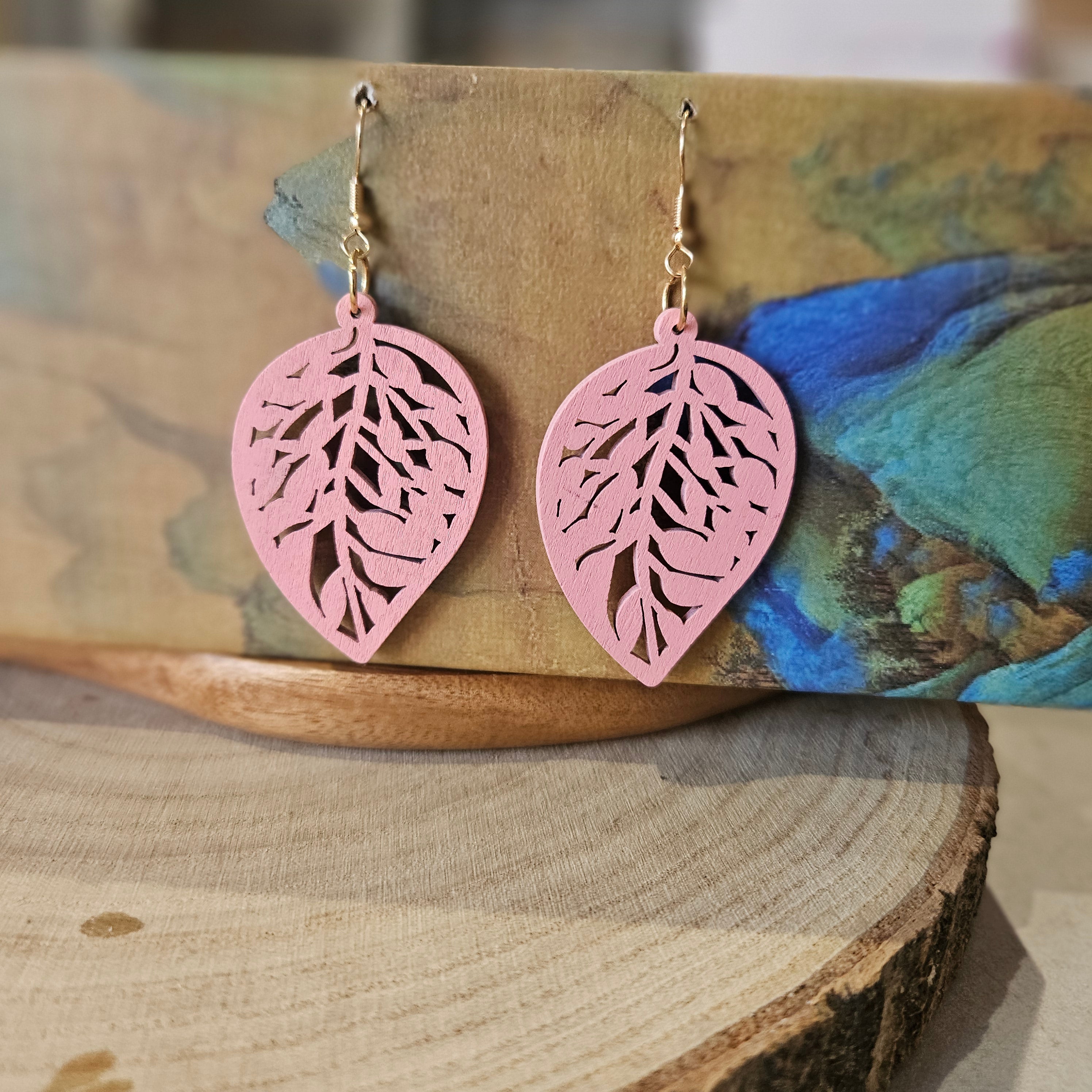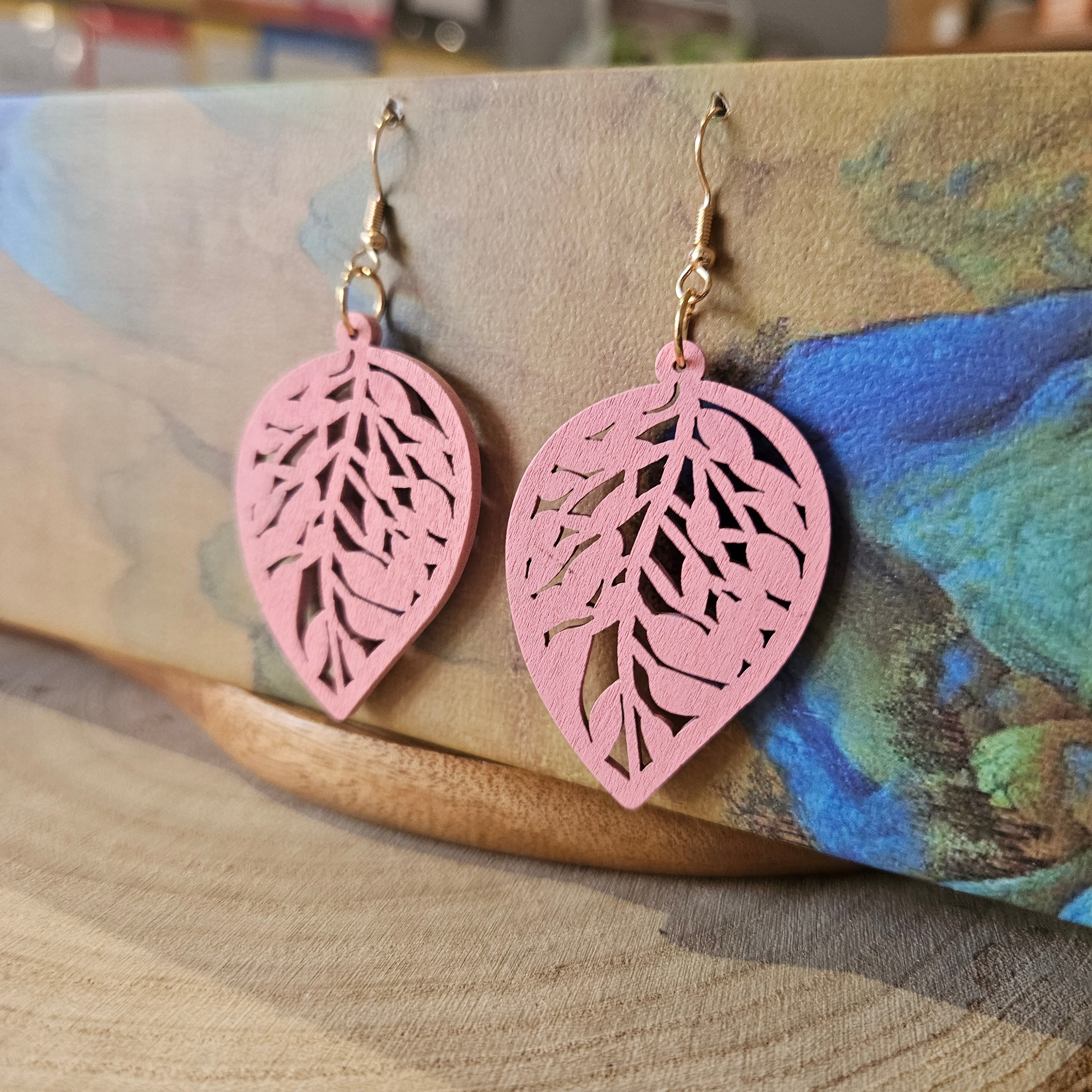 Wooden Leaf Shaped Earrings Pink